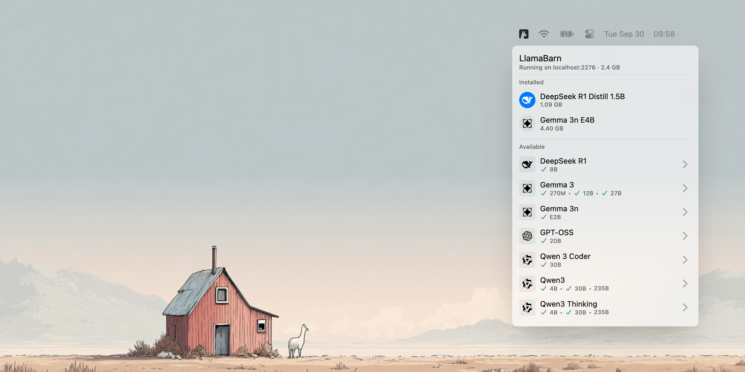 Run local LLMs on your Mac with a simple menu bar app. Launch any model with a single click, then chat with it via the built-in web UI or connect to it via the built-in REST API. LlamaBarn automatically configures models based on your Mac's hardware to ensure optimal performance and stability.