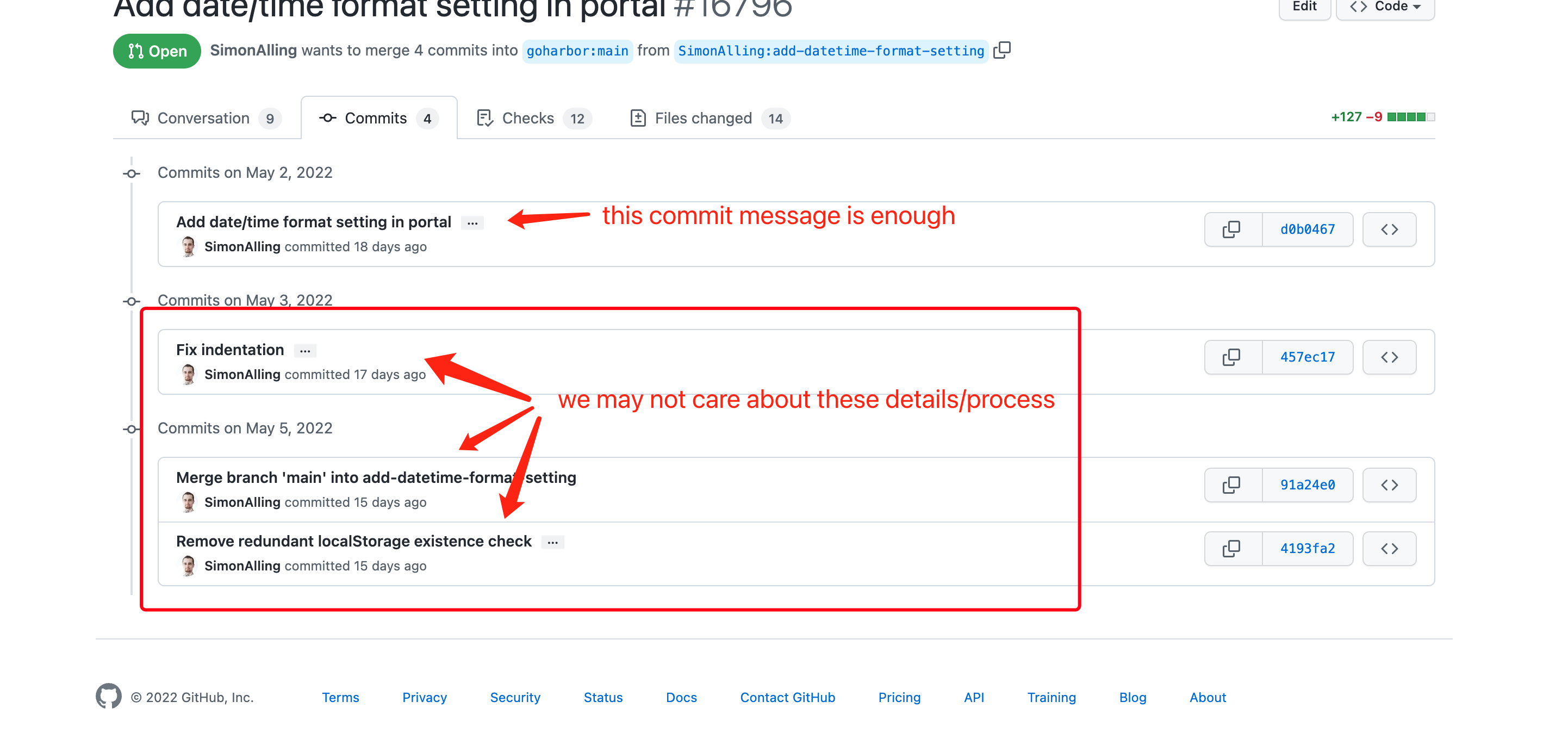 @SimonAlling In my opinion, the In actual development, in order to achieve a certain goal, we may decompose it into many steps, and each step may be a commit, but this does not mean that every commit is what we care about. So we use the |