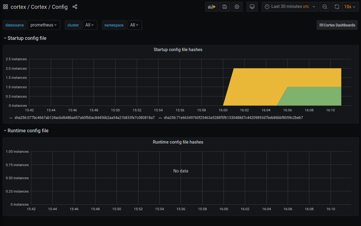 message: "An inconsistent config file hash is used across cluster customer-a/cortex.\n"