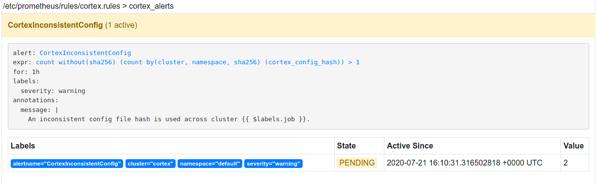 | count(count by(%s, job, sha256) (cortex_config_hash)) without(sha256) > 1 |