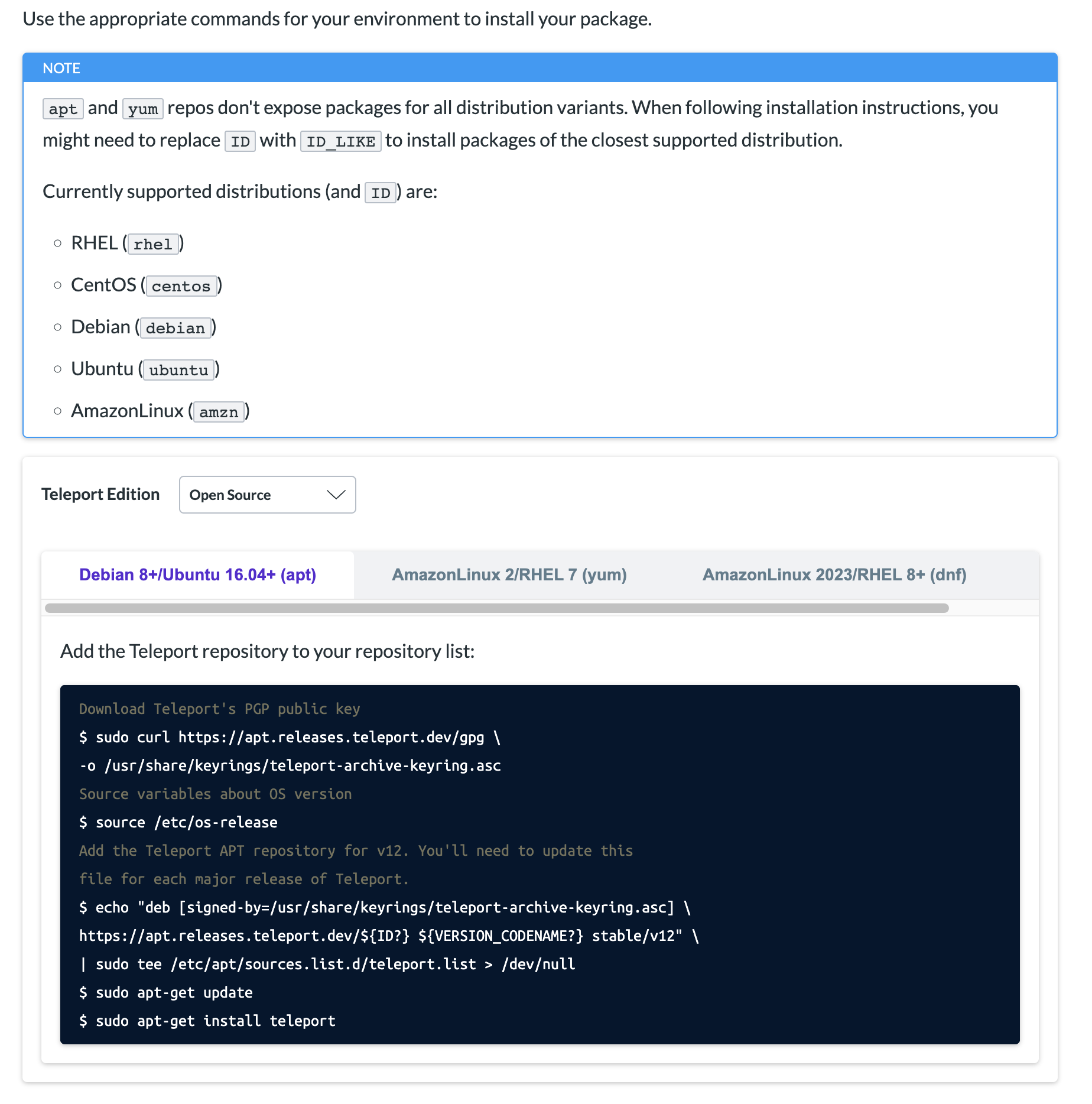 The PR is not mergeable in the current state because we don't support Amazon Linux 2023. I'm waiting to see if the issue #24007 can be addressed before Teleport 13. Else I'll split the Amazon Linux 2023 tabs.Amazon Linux support is out :)Note for reviewers: if you want to validate the installation instructions, we have a brand-new test package repositories (courtesy of @fheinecke ). e.g.