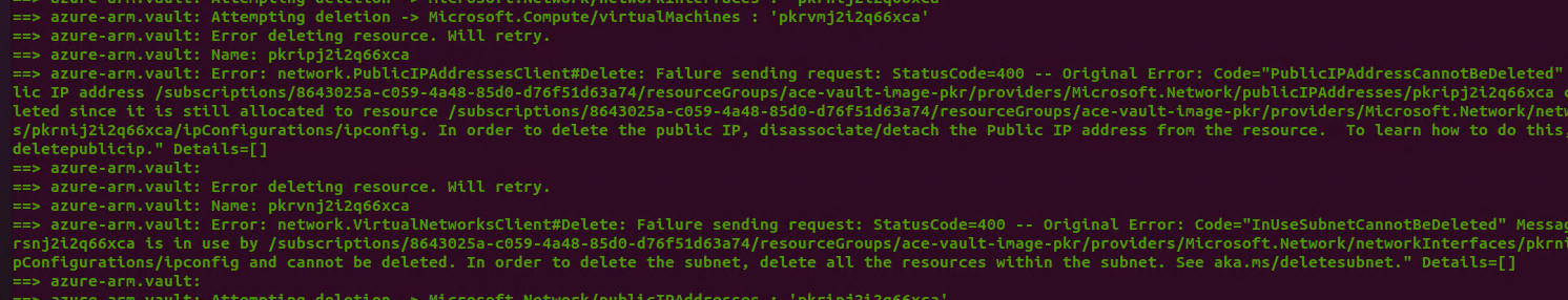 there was a bit of a gotcha. we skip cleaning up the template resources if packer created the resource group, because we'll delete the resource group. however using unmanaged disks creates a copy not in the temporary RG, but in the storage account for the images. this makes it difficult to run as a separate step, but we could unconditionally always clean up the individual resources in packer? It shouldn't actually be much worse than what Azure does internally for RG delete -- fire off deletes with retries on each of the individual resources, basically ignoring any dependencies. Then when we actually do the RG delete in the last step, it should be nearly immediate. This should have the added benefit of reducing the number of times the RG delete times out, which I see surprisingly often. |