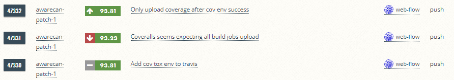 Above screenshot has 3 build results with exactly same source code, the top and bottom has only one job in each build, but the middle one has multiple jobs, only one job reports code coverage. So you will see coveralls.io still gave us false negative result.