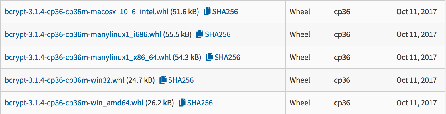 So one downside of using bcrypt is that it requires an external dependency. They are providing wheels for Windows, Mac and Linux, so that's good: