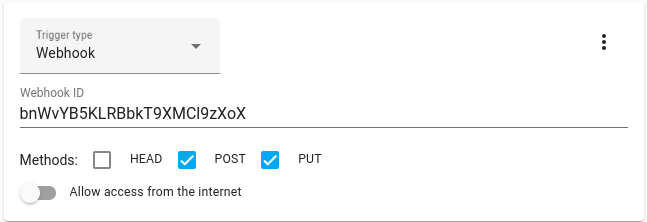 For 1, I'm making it so that Nabu Casa's webhooks still work regardless & any webhooks triggered via the websocket API still work too. For both of these, the user would have needed to explicitly enable it, so that seems safe to me. Number 2 will be easy to adapt for this PR, and add 'GET' as an option too. trigger: