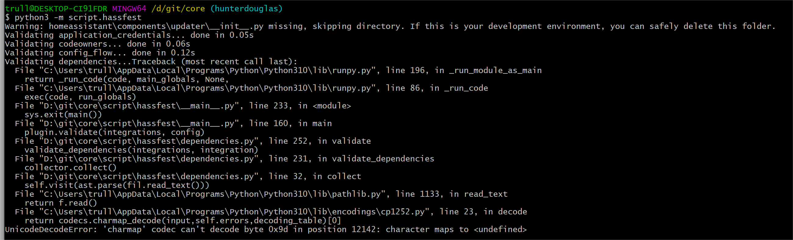 I'm not sure what is causing the encoding error on your system, but I went ahead and took care of running hassfest |
