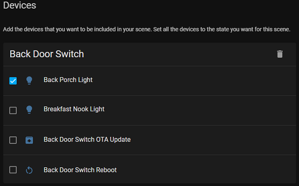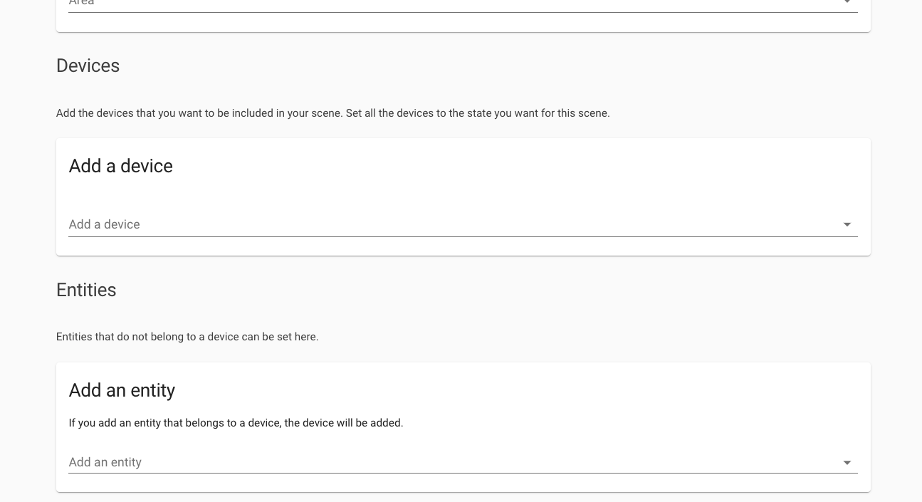 The scene editor currently only works with devices. You can pick an entity but if it has an associated device the device is what is added to the scene. This "works" but falls down with devices such as multi-gang smart switches where the individual states for each gang should not be forced to be used together in a scene. It is very common for 1 gang to control the lighting for 1 room / area and another gang to control the lighting in another room / area.