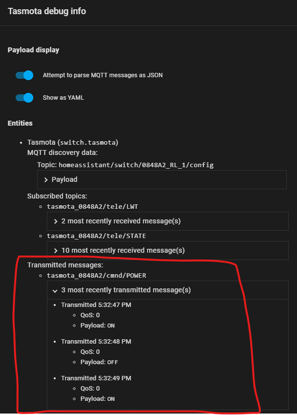 Display transmitted messages in MQTT debug info dialog