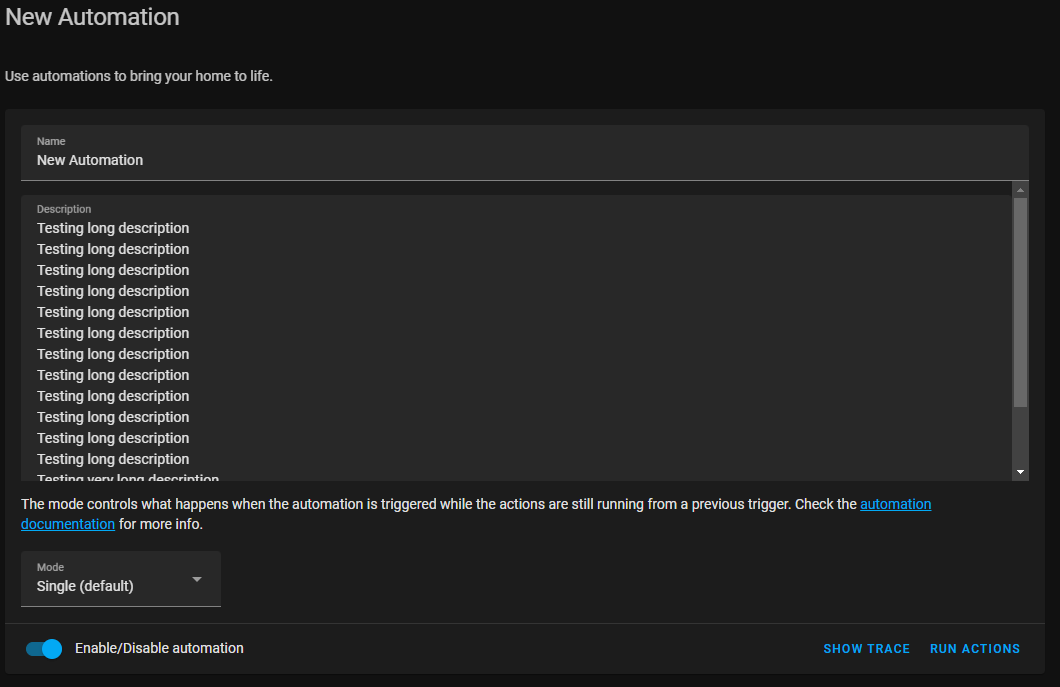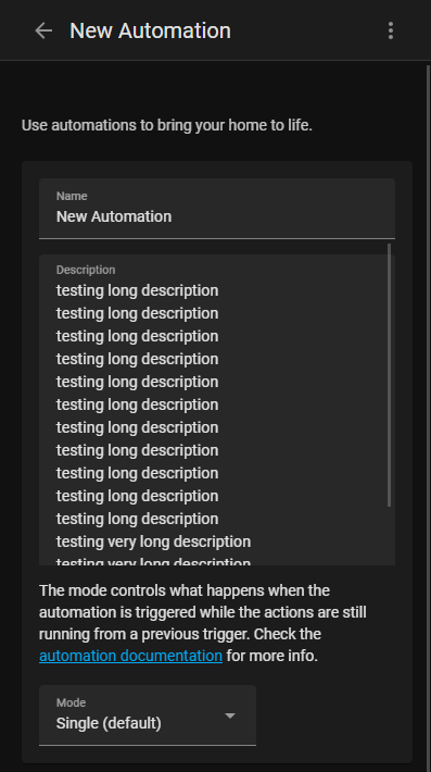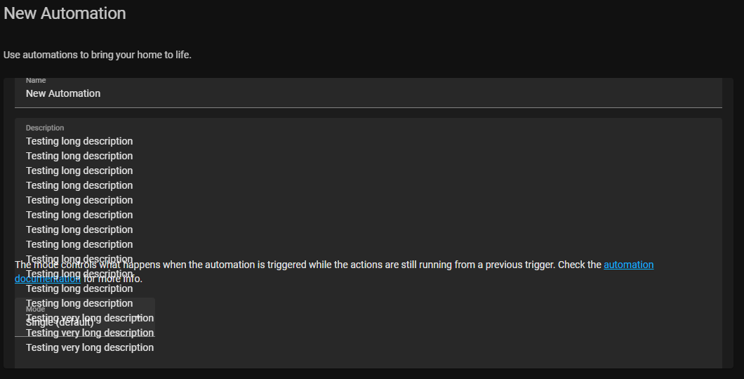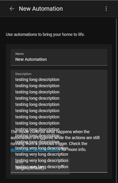 Very long automation descriptions can overflow into the sections below the description. This change increases the vertical space available for long descriptions and adds a scroll bar if the input text gets too long. This also fixes the same issue for very long Value Templates in the Trigger and Condition sections of an automation.