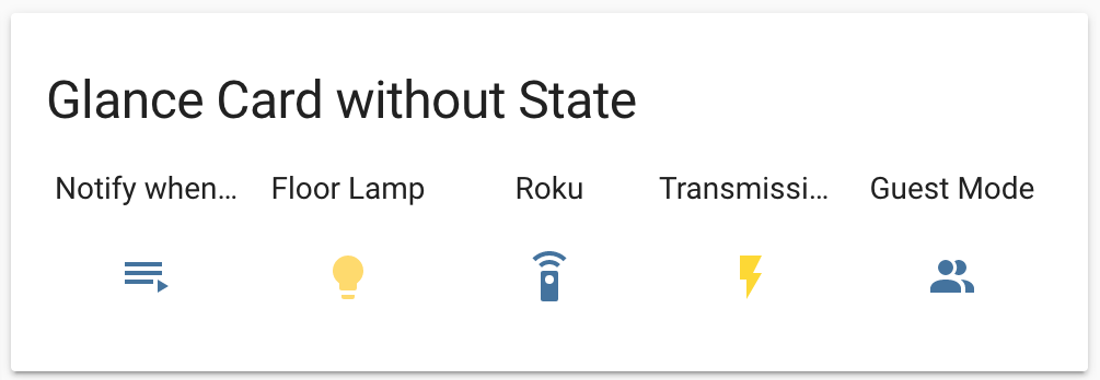 I agree that if most icons become yellow it would kinda defeat the point and just tip things too far in the opposite direction. But at the same time, the current icon coloring strategy feels somewhat arbitrary? For example: These all have the same exact "on" state, they're all in the same card, they all have toggles, yet some get coloring and others don't. They all look the same, yet behave differently. Isn't this kinda confusing for new users? I don't know how to easily explain this beyond "that's just the way things are." One idea I had before was to drop coloring on entity rows altogether. The reasoning being that in most cases there's a colorful blue toggle to quickly determine state, and coloring the icon feels like duplicated functionality. iOS and Android don't color icons when there's a toggle switch. Plus for non-controllable entities, the state is always shown right next to it as text. But I suspect this would be kinda controversial so I was too afraid to ever suggest it publicly 😄 IMO though, this has always been less about the Entities card and more about other cards like Glance and Button. The glance card can be configured with Everything is "on" here just like above, yet if you showed anyone this picture, they would say that two things are on and three are off. This is even more of an issue on the button card because that doesn't even have a |