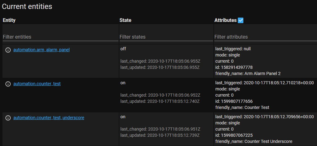 Initially I had though about adding another column for those timestamps, but since most entities anyway have multiple lines of attributes, there was always unused space in the state column which felt better. Reg. scanning of states: If you are looking for something specific you would anyway use the column filters, wouldn't you? |