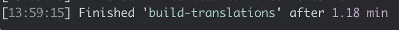 build-flattened-translationsgulp task. I profiled the task vianode --inspectand saw time spent in minification. Given the translations are already pure json files on a single line, I wondered if the minification was having any impact. I ran an MD5 hash over thebuild-translationsdirectory before and after commenting the line out and it gave the same hashes.Removing the line took this task down from 1.2 minutes to a couple of seconds on my Macbook pro 15. I removed the
