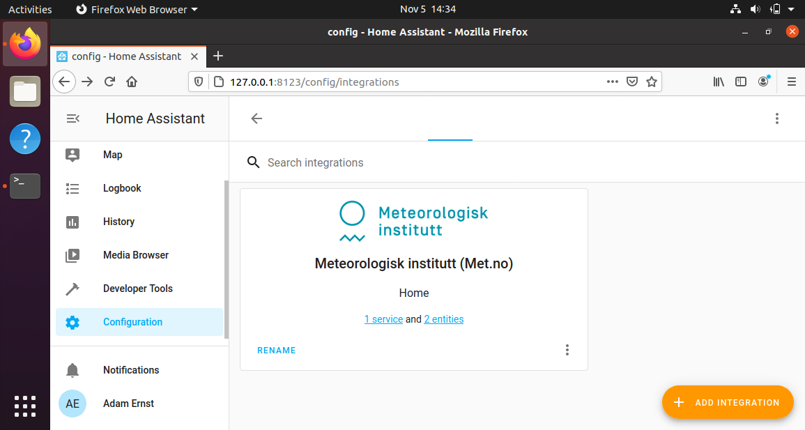 The Material "fab" (floating action button) to add a new integration is currently configured without a label.
