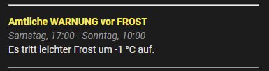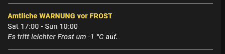 I have a markdown card that displays upcoming weather alerts. I show the weather condition plus of course the time period for when they are going to apply. Currently I have this template in the markdown card: