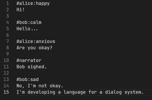 В игре будут диалоги с NPC, "диалоги" с предметами, происходящие в момент взаимодействия игрока с ними. Для удобства описания диалогов, я решил сделать для них специальный декларативный язык разметки, в котором можно будет описывать то, как будет происходить диалог между персонажами.