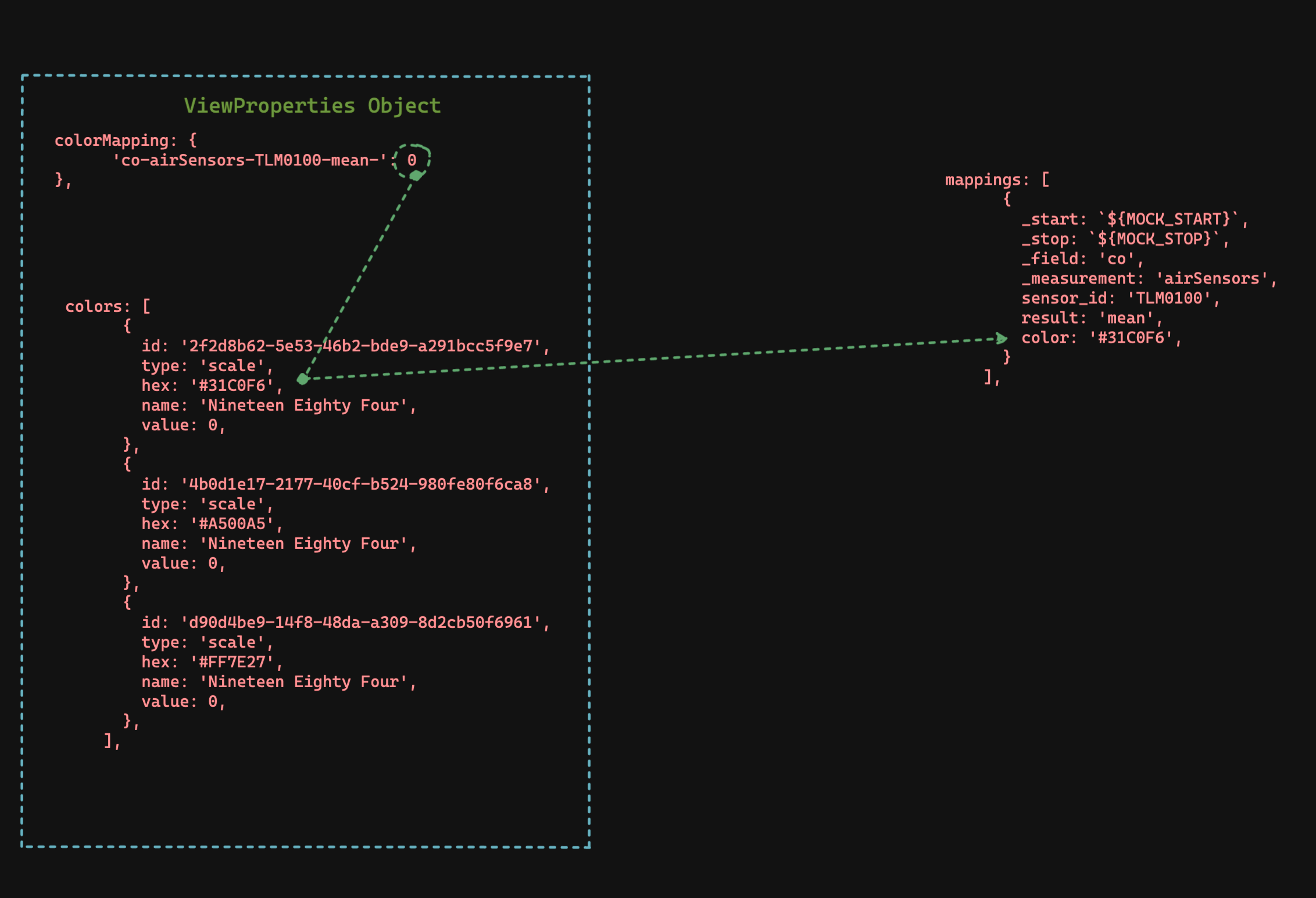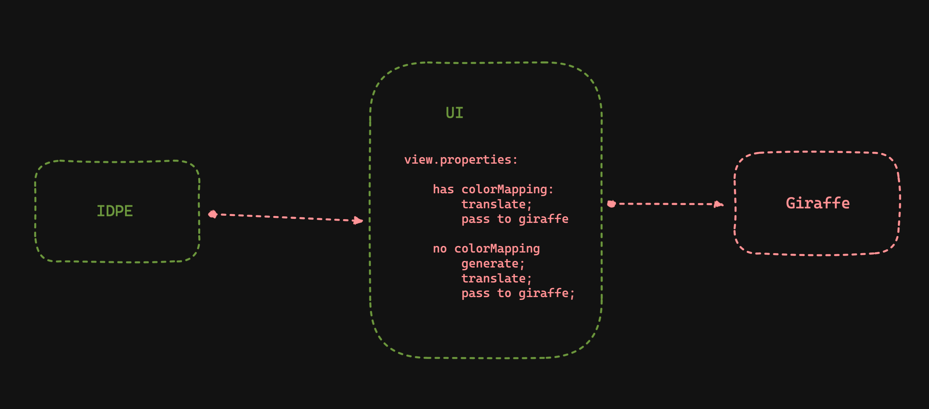 translateis basically looking at theviewProperties.colorMappingobject from theidpeand then looking up thecolorusing the index in theproperties.colorsarray. We then embed thecolorproperty into themappings.[series_index]object in giraffe.Visualization of how the colorMapping object is translated into color for the giraffe. This translation happens in the UI. (