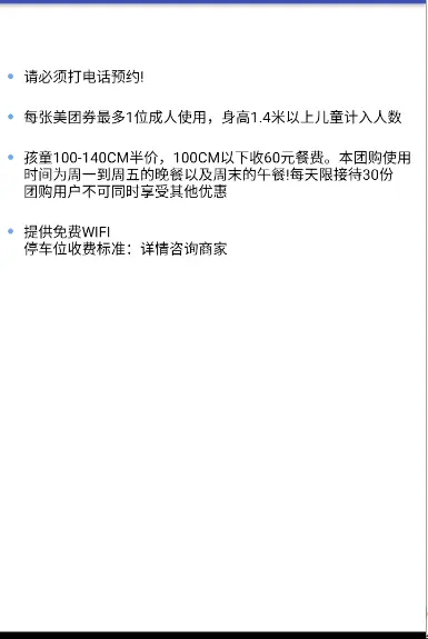 android:text="孩童100-140CM半价,100CM以下收60元餐费。本团购使用时间为周一到周五的晚餐以及周末的午餐!每天限接待30份\n团购用户不可同时享受其他优惠"