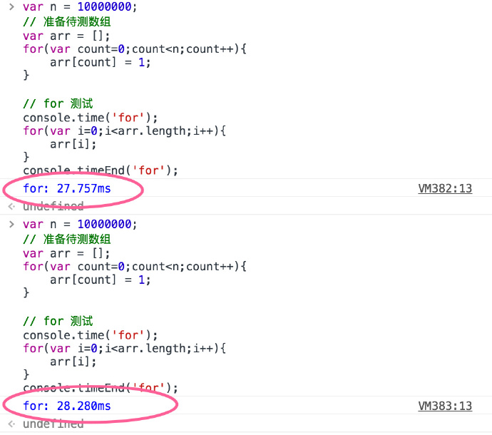 因为用控制台是测不出性能的,因为控制台本质上是个套了一大堆安全机制的eval,它的沙盒化程度很高。这里我们就一个简单的例子来对比一下,浏览器和node环境同样的代码的执行效率.