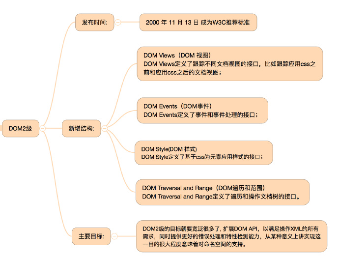 在DOM1的基础上DOM2引入了更多的交互能力,也支持了更高级的XML特性。DOM2将DOM分为更多具有联系的模块。DOM2级在原来DOM的基础上又扩充了鼠标、用户界面事件、范围、遍历等细分模块,而且通过对象接口增加了对CSS的支持。DOM1级中的DOM核心模块也经过扩展开始支持XML命名空间。在DOM2中引入了下列模块,在模块包含了众多新类型和新接口: