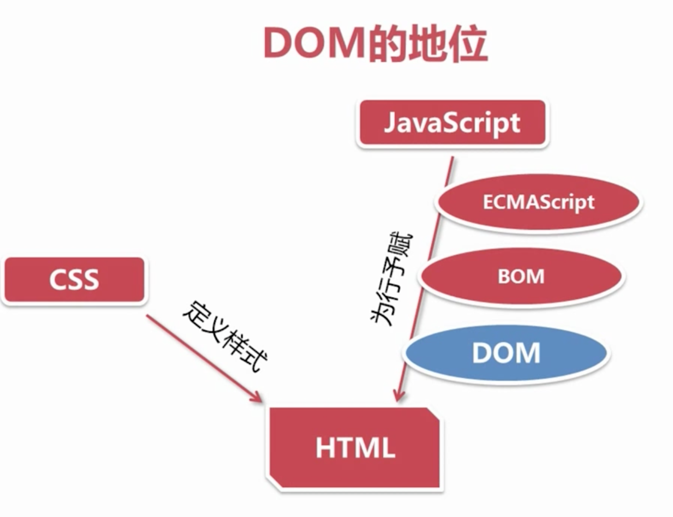 我们知道,一个网页是由html来搭建结构的,通过css来定义网页的样式,而JavaScript赋予了页面的行为,通过它我们可以与页面进行交互,实现页面的动画效果等等。那javascript究竟通过什么来实现的呢?通过ECMAScript这个标准,我们可以编写程序让浏览器来解析,利用ECMAScript,我们可以通过BOM对象(即browser object model)来操作浏览器窗口、浏览器导航对象(navigator)、屏幕分辨率(screen)、浏览器历史(history)、cookie等等。但这个通过BOM来实现的交互远远不够。要实现页面的动态交互和效果,操作html才是核心。那如何操作html呢?对,就是DOM,简单的说,DOM给我们提供了用程序来动态控制html的接口,也就是早期的DHTMl的概念。因此,DOM处在javascript赋予html具备动态交互和效果的能力的核心地位上。