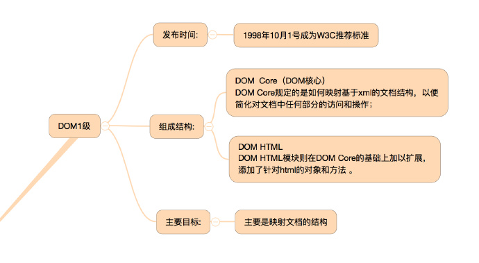 DOM1级主要定义了HTML和XML文档的底层结构。在DOM1中,DOM由两个模块组成:DOM Core(DOM核心)和DOM HTML。其中,DOM Core规定了基于XML的文档结构标准,通过这个标准简化了对文档中任意部分的访问和操作。DOM HTML则在DOM核心的基础上加以扩展,添加了针对HTML的对象和方法,如:JavaScript中的Document对象.
