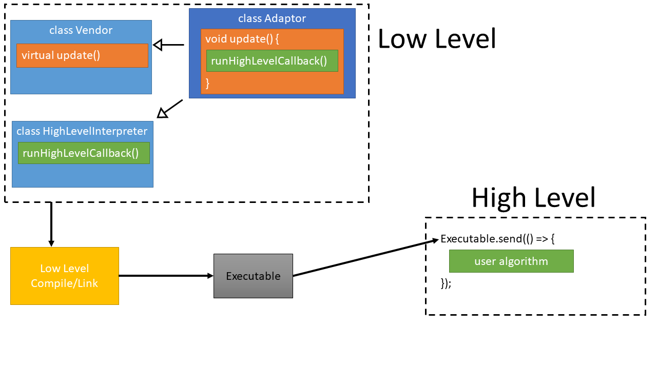 My work demonstrates an approach for linking a framework written in a low-level language to a high-level interpreter. I created a static adaptor class in the low-level language which inherits from both the original framework and an interpreter for the high level language; the adaptor stores a reference to the high-level callback and overrides a method in the original framework to execute the callback. This process requires no changes to the low-level framework and results in the ability to execute arbitrary logic within the high-level callback.
