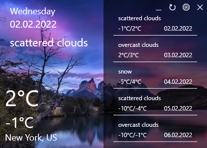 WeatherWidget - WPF-based client application that uses OpenWeatherMap API Немного запутанно из-за конвертации JsonResponce в OpenWeatherResponce из-за использования старых API-методов. TODO: переписать под более свежие API-методы и избавиться от лишних конвертаций