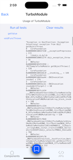 { "name": "Error", "message": "Exception in HostFunction: Intentional exception from ObjC getObjectThrows", "stack": "@[native code]\ngetObjectThrows@http://localhost:8081/js/RNTesterApp.ios.bundle:125422:129\nonPress@http://localhost:8081/js/RNTesterApp.ios.bundle:125549:71\n_performTransitionSideEffects@http://localhost:8081/js/RNTesterApp.ios.bundle:51025:22\n_receiveSignal@http://localhost:8081/js/RNTesterApp.ios.bundle:50981:45\nonResponderRelease@http://localhost:8081/js/RNTesterApp.ios.bundle:50844:34\ninvokeGuardedCallbackProd@http://localhost:8081/js/RNTesterApp.ios.bundle:3232:21\ninvokeGuardedCallback@http://localhost:8081/js/RNTesterApp.ios.bundle:3318:42\ninvokeGuardedCallbackAndCatchFirstError@http://localhost:8081/js/RNTesterApp.ios.bundle:3321:36\nexecuteDispatch@http://localhost:8081/js/RNTesterApp.ios.bundle:3385:48\nexecuteDispatchesInOrder@http://localhost:8081/js/RNTesterApp.ios.bundle:3402:26\nexecuteDispatchesAndRelease@http://localhost:8081/js/RNTesterApp.ios.bundle:5126:35\nforEach@[native code]\nforEachAccumulated@http://localhost:8081/js/RNTesterApp.ios.bundle:3844:22\nrunEventsInBatch@http://localhost:8081/js/RNTesterApp.ios.bundle:5144:27\nrunExtractedPluginEventsInBatch@http://localhost:8081/js/RNTesterApp.ios.bundle:5166:25\n@http://localhost:8081/js/RNTesterApp.ios.bundle:5184:42\nbatchedUpdates$1@http://localhost:8081/js/RNTesterApp.ios.bundle:15020:20\nbatchedUpdates@http://localhost:8081/js/RNTesterApp.ios.bundle:5115:36\ndispatchEvent@http://localhost:8081/js/RNTesterApp.ios.bundle:5177:23", "cause": { "name": "Excepption", "message": "Intentional exception from ObjC getObjectThrows", "stack": "0 CoreFoundation 0x0000000180437330 __exceptionPreprocess + 172\n1 libobjc.A.dylib 0x0000000180051274 objc_exception_throw + 56\n2 RNTester 0x0000000103535900 -[RCTSampleTurboModule getObjectThrows:] + 120\n3 CoreFoundation 0x000000018043d6c0 __invoking___ + 144\n4 CoreFoundation 0x000000018043aa44 -[NSInvocation invoke] + 276\n5 CoreFoundation 0x000000018043acdc -[NSInvocation invokeWithTarget:] + 60\n6 RNTester 0x00000001032b066c ___ZN8facebook5react15ObjCTurboModule23performMethodInvocationERNS_3jsi7RuntimeENS0_26TurboModuleMethodValueKindEPKcP12NSInvocationP14NSMutableArray_block_invoke + 244\n7 RNTester 0x00000001032afe68 _ZN8facebook5react15ObjCTurboModule23performMethodInvocationERNS_3jsi7RuntimeENS0_26TurboModuleMethodValueKindEPKcP12NSInvocationP14NSMutableArray + 528\n8 RNTester 0x00000001032b38f0 _ZN8facebook5react15ObjCTurboModule16invokeObjCMethodERNS_3jsi7RuntimeENS0_26TurboModuleMethodValueKindERKNSt3__112basic_stringIcNS6_11char_traitsIcEENS6_9allocatorIcEEEEP13objc_selectorPKNS2_5ValueEm + 608\n9 RNTester 0x0000000103533c18 _ZN8facebook5reactL61__hostFunction_NativeSampleTurboModuleSpecJSI_getObjectThrowsERNS_3jsi7RuntimeERNS0_11TurboModuleEPKNS1_5ValueEm + 112\n10 RNTester 0x0000000102f1b0c4 _ZZN8facebook5react11TurboModule6createERNS_3jsi7RuntimeERKNS2_10PropNameIDEENKUlS4_RKNS2_5ValueEPS9_mE_clES4_SA_SB_m + 68\n11 RNTester 0x0000000102f1b074 _ZNSt3__18__invokeB6v15006IRZN8facebook5react11TurboModule6createERNS1_3jsi7RuntimeERKNS4_10PropNameIDEEUlS6_RKNS4_5ValueEPSB_mE_JS6_SC_SD_mEEEDTclclsr3stdE7declvalIT_EEspclsr3stdE7declvalIT0_EEEEOSG_DpOSH_ + 72\n12 RNTester 0x0000000102f1affc _ZNSt3__128__invoke_void_return_wrapperIN8facebook3jsi5ValueELb0EE6__callIJRZNS1_5react11TurboModule6createERNS2_7RuntimeERKNS2_10PropNameIDEEUlS9_RKS3_PSD_mE_S9_SE_SF_mEEES3_DpOT_ + 64\n13 RNTester 0x0000000102f1afb0 _ZNSt3__110__function12__alloc_funcIZN8facebook5react11TurboModule6createERNS2_3jsi7RuntimeERKNS5_10PropNameIDEEUlS7_RKNS5_5ValueEPSC_mE_NS_9allocatorISF_EEFSB_S7_SD_SE_mEEclB6v15006ES7_SD_OSE_Om + 72\n14 RNTester 0x0000000102f19f60 _ZNSt3__110__function6__funcIZN8facebook5react11TurboModule6createERNS2_3jsi7RuntimeERKNS5_10PropNameIDEEUlS7_RKNS5_5ValueEPSC_mE_NS_9allocatorISF_EEFSB_S7_SD_SE_mEEclES7_SD_OSE_Om + 68\n15 RNTester 0x00000001034df970 _ZNKSt3__110__function12__value_funcIFN8facebook3jsi5ValueERNS3_7RuntimeERKS4_PS7_mEEclB6v15006ES6_S8_OS9_Om + 112\n16 RNTester 0x00000001034df374 _ZNKSt3__18functionIFN8facebook3jsi5ValueERNS2_7RuntimeERKS3_PS6_mEEclES5_S7_S8_m + 72\n17 RNTester 0x00000001034deaac _ZZN8facebook3jsc10JSCRuntime30createFunctionFromHostFunctionERKNS_3jsi10PropNameIDEjNSt3__18functionIFNS2_5ValueERNS2_7RuntimeERKS8_PSB_mEEEEN20HostFunctionMetadata4callEPK15OpaqueJSContextP13OpaqueJSValueSL_mPKPKSK_PSN_ + 720\n18 JavaScriptCore 0x000000010a56e754 _ZN3JSCL34callJSNonFinalObjectCallbackObjectEPNS_14JSGlobalObjectEPNS_9CallFrameE + 436\n19 JavaScriptCore 0x000000010ad60b78 _ZN3JSC14handleHostCallEPNS_14JSGlobalObjectEPNS_9CallFrameENS_7JSValueEPNS_12CallLinkInfoE + 1016\n20 JavaScriptCore 0x000000010ad169dc operationLinkCall + 156\n21 ??? 0x0000000280004330 0x0 + 10737435440\n22 JavaScriptCore 0x000000010a4bba08 llint_entry + 147988\n23 JavaScriptCore 0x000000010a4bba08 llint_entry + 147988\n24 JavaScriptCore 0x000000010a4bba08 llint_entry + 147988\n25 JavaScriptCore 0x000000010a4bb978 llint_entry + 147844\n26 JavaScriptCore 0x000000010a4bb978 llint_entry + 147844\n27 ??? 0x0000000280325200 0x0 + 10740716032\n28 ??? 0x000000028025f558 0x0 + 10739905880\n29 ??? 0x000000028025ed34 0x0 + 10739903796\n30 ??? 0x00000002803deac4 0x0 + 10741476036\n31 ??? 0x00000002802b7d4c 0x0 + 10740268364\n32 ??? 0x00000002801b2b40 0x0 + 10739198784\n33 ??? 0x0000000280385c74 0x0 + 10741111924\n34 ??? 0x0000000280384a7c 0x0 + 10741107324\n35 ??? 0x0000000280255920 0x0 + 10739865888\n36 ??? 0x00000002801a7dfc 0x0 + 10739154428\n37 ??? 0x00000002802c6d00 0x0 + 10740329728\n38 JavaScriptCore 0x000000010a497550 vmEntryToJavaScript + 256\n39 JavaScriptCore 0x000000010ac69b2c _ZN3JSC11Interpreter11executeCallEPNS_14JSGlobalObjectEPNS_8JSObjectERKNS_8CallDataENS_7JSValueERKNS_7ArgListE + 496\n40 JavaScriptCore 0x000000010a57fd6c JSObjectCallAsFunction + 612\n41 RNTester 0x00000001034da610 _ZN8facebook3jsc10JSCRuntime4callERKNS_3jsi8FunctionERKNS2_5ValueEPS7_m +