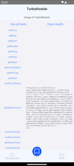 { "name": "Error", "message": "Exception in HostFunction: Intentional exception from JVM getObjectThrows with {"c":null,"b":"foo","a":1}", "stack": "[native code]\ngetObjectThrows@http://10.0.2.2:8081/js/examples/TurboModule/SampleTurboModuleExample.bundle?platform=android&app=com.facebook.react.uiapp&modulesOnly=true&dev=true&minify=false&runModule=true&shallow=true:105:129\nonPress@http://10.0.2.2:8081/js/examples/TurboModule/SampleTurboModuleExample.bundle?platform=android&app=com.facebook.react.uiapp&modulesOnly=true&dev=true&minify=false&runModule=true&shallow=true:228:71\n_performTransitionSideEffects@http://10.0.2.2:8081/js/RNTesterApp.android.bundle?platform=android&dev=true&minify=false&app=com.facebook.react.uiapp&modulesOnly=false&runModule=true:51558:22\n_receiveSignal@http://10.0.2.2:8081/js/RNTesterApp.android.bundle?platform=android&dev=true&minify=false&app=com.facebook.react.uiapp&modulesOnly=false&runModule=true:51514:45\nonResponderRelease@http://10.0.2.2:8081/js/RNTesterApp.android.bundle?platform=android&dev=true&minify=false&app=com.facebook.react.uiapp&modulesOnly=false&runModule=true:51377:34\ninvokeGuardedCallbackProd@http://10.0.2.2:8081/js/RNTesterApp.android.bundle?platform=android&dev=true&minify=false&app=com.facebook.react.uiapp&modulesOnly=false&runModule=true:3292:21\ninvokeGuardedCallback@http://10.0.2.2:8081/js/RNTesterApp.android.bundle?platform=android&dev=true&minify=false&app=com.facebook.react.uiapp&modulesOnly=false&runModule=true:3378:42\ninvokeGuardedCallbackAndCatchFirstError@http://10.0.2.2:8081/js/RNTesterApp.android.bundle?platform=android&dev=true&minify=false&app=com.facebook.react.uiapp&modulesOnly=false&runModule=true:3381:36\nexecuteDispatch@http://10.0.2.2:8081/js/RNTesterApp.android.bundle?platform=android&dev=true&minify=false&app=com.facebook.react.uiapp&modulesOnly=false&runModule=true:3445:48\nexecuteDispatchesInOrder@http://10.0.2.2:8081/js/RNTesterApp.android.bundle?platform=android&dev=true&minify=false&app=com.facebook.react.uiapp&modulesOnly=false&runModule=true:3462:26\nexecuteDispatchesAndRelease@http://10.0.2.2:8081/js/RNTesterApp.android.bundle?platform=android&dev=true&minify=false&app=com.facebook.react.uiapp&modulesOnly=false&runModule=true:5186:35\nforEach@[native code]\nforEachAccumulated@http://10.0.2.2:8081/js/RNTesterApp.android.bundle?platform=android&dev=true&minify=false&app=com.facebook.react.uiapp&modulesOnly=false&runModule=true:3904:22\nrunEventsInBatch@http://10.0.2.2:8081/js/RNTesterApp.android.bundle?platform=android&dev=true&minify=false&app=com.facebook.react.uiapp&modulesOnly=false&runModule=true:5204:27\nrunExtractedPluginEventsInBatch@http://10.0.2.2:8081/js/RNTesterApp.android.bundle?platform=android&dev=true&minify=false&app=com.facebook.react.uiapp&modulesOnly=false&runModule=true:5226:25\nhttp://10.0.2.2:8081/js/RNTesterApp.android.bundle?platform=android&dev=true&minify=false&app=com.facebook.react.uiapp&modulesOnly=false&runModule=true:5244:42\nbatchedUpdates$1@http://10.0.2.2:8081/js/RNTesterApp.android.bundle?platform=android&dev=true&minify=false&app=com.facebook.react.uiapp&modulesOnly=false&runModule=true:15080:20\nbatchedUpdates@http://10.0.2.2:8081/js/RNTesterApp.android.bundle?platform=android&dev=true&minify=false&app=com.facebook.react.uiapp&modulesOnly=false&runModule=true:5175:36dispatchEvent@http://10.0.2.2:8081/js/RNTesterApp.android.bundle?platform=android&dev=true&minify=false&app=com.facebook.react.uiapp&modulesOnly=false&runModule=true:5237:23", "line": 105, "column": 129, "sourceURL": "http://10.0.2.2:8081/js/examples/TurboModule/SampleTurboModuleExample.bundle?platform=android&app=com.facebook.react.uiapp&modulesOnly=true&dev=true&minify=false&runModule=true&shallow=true" "cause": { "name": "java.lang.RuntimeException", "message": "Intentional exception from JVM getObjectThrows with {\"c\":null,\"b\":\"foo\",\"a\":1}", "stack": "com.facebook.fbreact.specs.SampleTurboModule.getObjectThrows(SampleTurboModule.java:194)\ncom.facebook.jni.NativeRunnable.run(Native Method)\nandroid.os.Handler.handleCallback(Handler.java:942)\nandroid.os.Handler.dispatchMessage(Handler.java:99)\ncom.facebook.react.bridge.queue.MessageQueueThreadHandler.dispatchMessage(MessageQueueThreadHandler.java:27)\nandroid.os.Looper.loopOnce(Looper.java:201)\nandroid.os.Looper.loop(Looper.java:288)\ncom.facebook.react.bridge.queue.MessageQueueThreadImpl$4.run(MessageQueueThreadImpl.java:228)\njava.lang.Thread.run(Thread.java:1012)\n", "stackArray": [ { "className": "com.facebook.fbreact.specs.SampleTurboModule", "fileName": "SampleTurboModule.java", "lineNumber": 194, "methodName": "getObjectThrows" }, { "className": "com.facebook.jni.NativeRunnable", "fileName": "NativeRunnable.java", "lineNumber": -2, "methodName": "run" }, { "className": "android.os.Handler", "fileName": "Handler.java", "lineNumber": 942, "methodName": "handleCallback" }, { "className": "android.os.Handler", "fileName": "Handler.java", "lineNumber": 99, "methodName": "dispatchMessage" }, { "className": "com.facebook.react.bridge.queue.MessageQueueThreadHandler", "fileName": "MessageQueueThreadHandler.java", "lineNumber": 27, "methodName": "dispatchMessage" }, { "className": "android.os.Looper", "fileName": "Looper.java", "lineNumber": 201, "methodName": "loopOnce" }, { "className": "android.os.Looper", "fileName": "Looper.java", "lineNumber": 288, "methodName": "loop" }, { "className": "com.facebook.react.bridge.queue.MessageQueueThreadImpl$4", "fileName": "MessageQueueThreadImpl.java", "lineNumber": 228, "methodName": "run" }, { "className": "java.lang.Thread", "fileName": "Thread.java", "lineNumber": 1012, "methodName": "run" } ] }, }Example of NSException in JS: