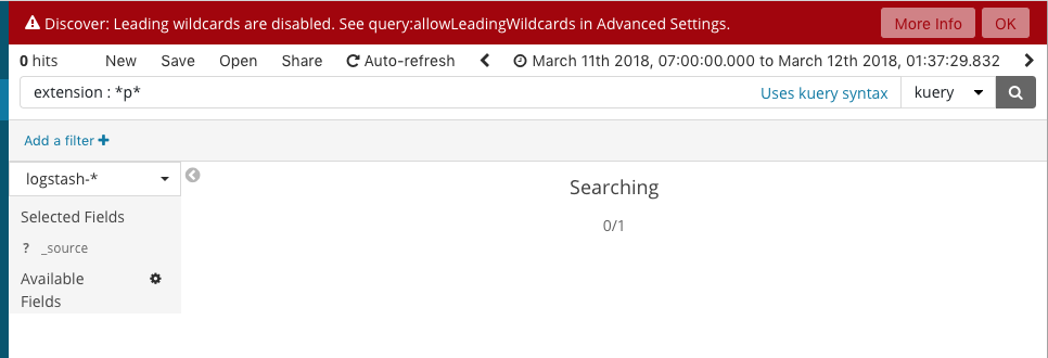| `query:allowLeadingWildcards`:: When set, * is allowed as the first character in a query clause. Currently only applies when experimental query features are enabled in the query bar. To disallow leading wildcards in basic lucene queries, use query:queryString:options. |