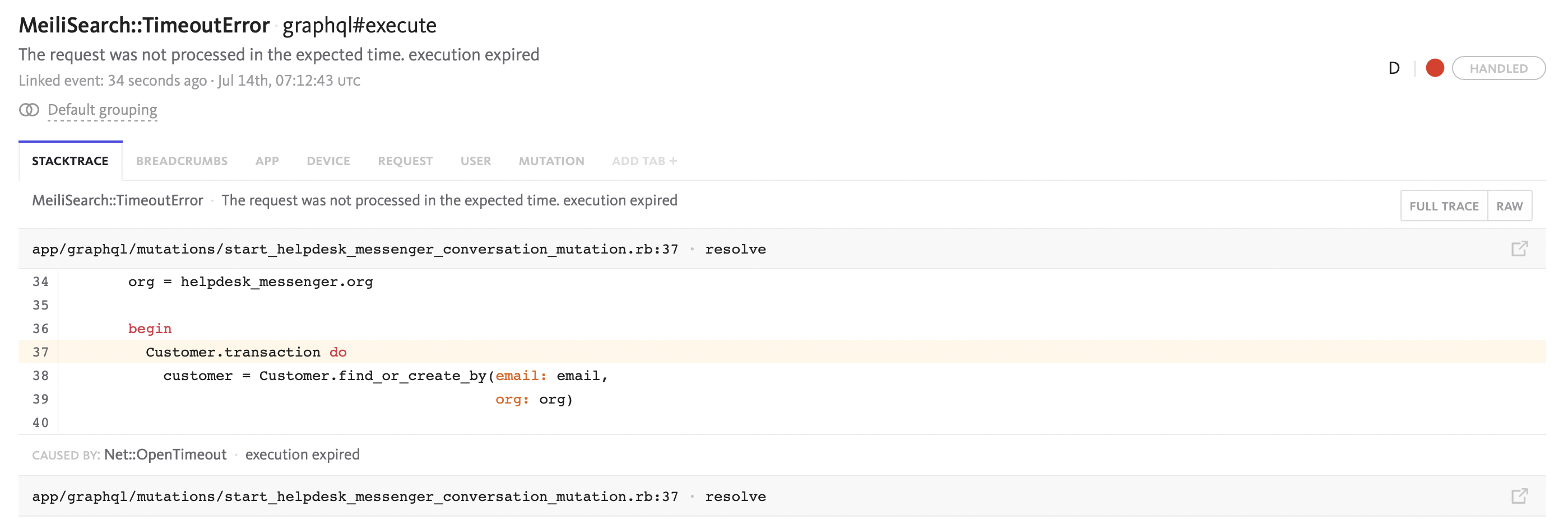 When creating records within the Rails app connected to a Meilisearch instance that is not responding correctly, transactions fail.
