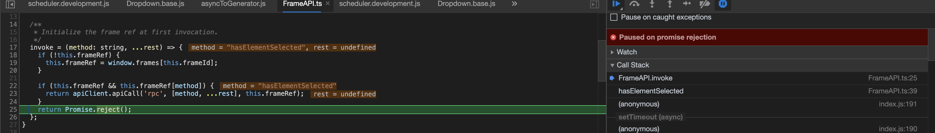 When developer tools are opened in common browsers, they are often configured to pause on unhandled rejections like this. And the way you describe it seems like this is a concern of the Visual Editor and the behavior is a pretty big leak of the abstraction. |