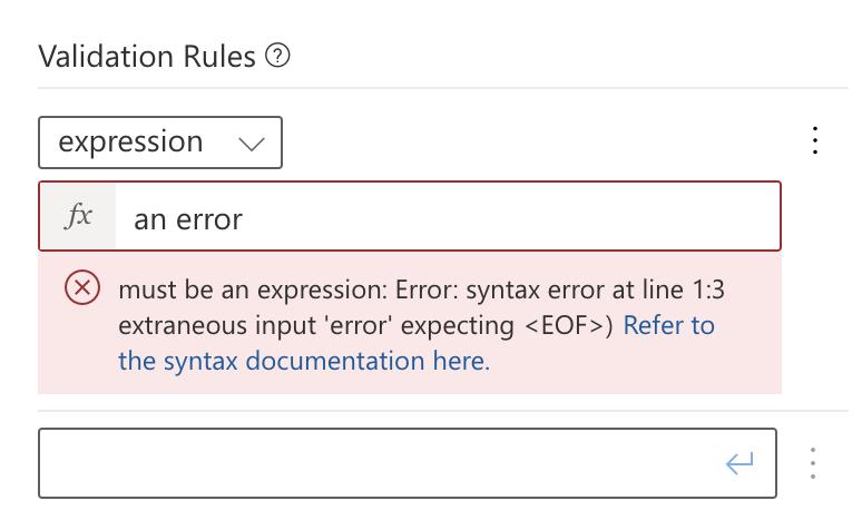 Fixed the 'Validation Rules' array styling so the expression expands to use the full width of the property editor and errors render below the text field instead of next to it.