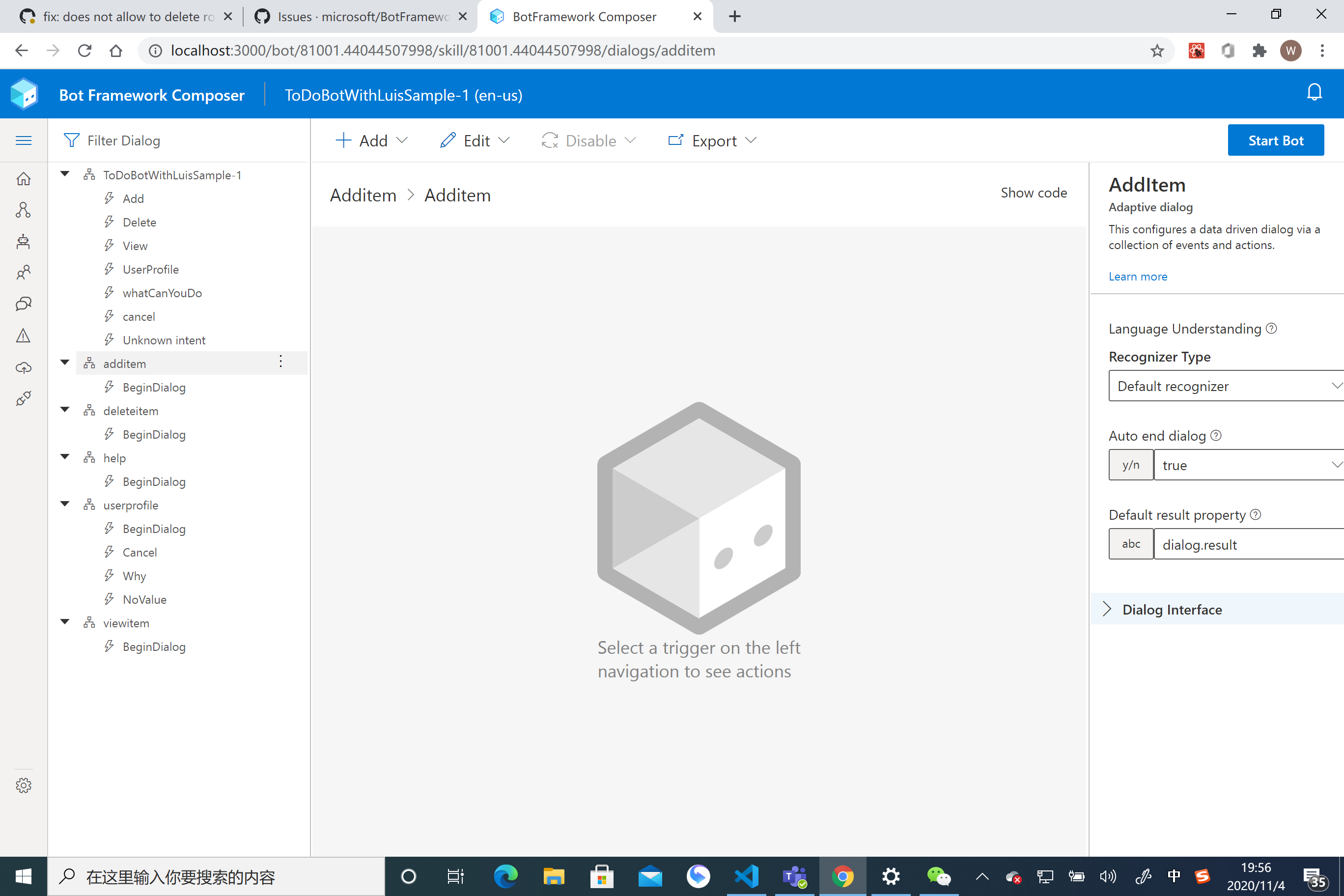 * Fix: form dialog view dialog action * Fix: Prevent dismissing a property card due to click during text selection within the card * feat: update sdk package to 4.11.0-rc2 (microsoft#4625) * Update sdk package to 4.11.0-rc2 * Fix tests for ReplaceDialog * Delete the default appsettings that ships with qna (microsoft#4650) Signed-off-by: Srinaath Ravichandran <[email protected]> Co-authored-by: Srinaath Ravichandran <[email protected]> * fix: dialog resources recognizer/qna incorrect creation (microsoft#4612) * fix customize imported dialog resource auto creation * add test * avoid touch form generated dialog * update detecting * update test * update detecting at server Co-authored-by: Chris Whitten <[email protected]> * larger warning icon (microsoft#4665) * fix: Test/Start buttons unable to click. (microsoft#4666) * filter hidden card, do not render empty container * update Co-authored-by: Dong Lei <[email protected]> * fix: azure publish fail (microsoft#4660) Co-authored-by: Dong Lei <[email protected]> * always show "create from scratch" button in "from url modal" (microsoft#4662) Co-authored-by: Dong Lei <[email protected]> * fix: update 'Disable/Enable' buttons state in realtime (microsoft#4664) * add dialog content as a dep of useMemo microsoft#4629 * remove log Co-authored-by: Dong Lei <[email protected]> * does not allow to delete root bot (microsoft#4671) * fix: Visual canvas mess up when add new actions in a zoom in/out mode (microsoft#4672) * fix: mess when zoom in/out * use scroll Co-authored-by: Dong Lei <[email protected]> * use throttle 200 instead of debounce 1000 (microsoft#4670) Co-authored-by: Dong Lei <[email protected]> Co-authored-by: Chris Whitten <[email protected]> * promisify the 'saveData()' api and fix microsoft#4616 (microsoft#4667) Co-authored-by: Chris Whitten <[email protected]> * fix: Form dialog hidden fixed feature flags (microsoft#4675) * Form dialog hidden fixed feature flags * remove temp lint directive * Removed debugging vars * don't install package during eject js runtime, install and build when publish (microsoft#4668) Co-authored-by: Dong Lei <[email protected]> Co-authored-by: Lu Han <[email protected]> * fix: misordered using directives in runtime (microsoft#4684) * Update Startup.cs * Update runtime/dotnet/azurewebapp/Startup.cs * add region parameter to luis build call options (microsoft#4685) * change Microsoft.UpdateActivity title from "Send an activity" to "Update an activity" (microsoft#4686) Co-authored-by: Dong Lei <[email protected]> * read recognizer intent from dialog content (microsoft#4683) Co-authored-by: Dong Lei <[email protected]> * fix: router cache bug (microsoft#4687) * clean all router cache when switching project * reset routerCache * should check rootProjectId Co-authored-by: Dong Lei <[email protected]> * Fix variable name (microsoft#4661) Co-authored-by: Dong Lei <[email protected]> * feature: Supporting core+package templates stored on NuGet (microsoft#4588) * - added hosted template to template list - updated template type to account for hosted templates * initial scaffolding of hosted template grab * external nuget template working e2e as template in creation flow * Removing redundent types * adding support for relative runtime paths. Removing unused dependencies. * adding comments and removing autogenerated yan lock file from root dir * Adding version to template acquasition Generating build files Fixing broken unit test * updating template version to latest stable * hiding remote template feature flag until NuGet packages are public * Making PR changes * simplifying featureflag logic changing feature flag default values * removing bad null check * update naming * Fixing broken test updating locale files with latest added strings * Removing 'del' dependency in favor of rimraf for directory deletions * Reverting feature flag bug fix in favor for bug fix implemented in seperate PR Co-authored-by: Patrick Volum <[email protected]> Co-authored-by: Chris Whitten <[email protected]> * fix: breadcrumb display for ProjectTree (microsoft#4604) * remove old breadcrumbs and start making new ones * Update DesignPage.tsx * Update DesignPage.tsx * update unit tests to remove breadcrumb things * fix duplicate key bug in breadcrumbs * fix e2e test * detect and display action names in breadcrumb * rewrite to make typechecker happy * make new DesignPage unit tests * Update publisher.ts * Update publisher.ts * restore navigation in undo * retrieve breadcrumb from URL on location change * read double-nested $designer fields * navigate to trigger[0] on OpenDialog node events * fix typo and unit tests * Update validateDialogName.test.ts * better error-checking for invalid URLs * make special "beginDialog" trigger * Update en-US.json * Update DesignPage.tsx * initialize onboarding status to complete in non-production * restore WelcomeModalCloseIcon to ToDoBot test Co-authored-by: Chris Whitten <[email protected]> * fix: Sorting OneOfField options / better default type (microsoft#4673) * Sorting OneOfField options based on type weights * Fix test * fix test Co-authored-by: Geoff Cox (Microsoft) <[email protected]> * Updated locale from building (microsoft#4694) * when changes on common.lg, reparse all lgFiles (microsoft#4669) Co-authored-by: Dong Lei <[email protected]> Co-authored-by: Chris Whitten <[email protected]> * Update projectTemplates.ts (microsoft#4697) * fix: undo/redo (microsoft#4688) * Bot proj breadcrumbs (microsoft#4) * remove old breadcrumbs and start making new ones * Update DesignPage.tsx * Update DesignPage.tsx * update unit tests to remove breadcrumb things * fix duplicate key bug in breadcrumbs * fix e2e test * detect and display action names in breadcrumb * rewrite to make typechecker happy * make new DesignPage unit tests * Update publisher.ts * Update publisher.ts * restore navigation in undo * retrieve breadcrumb from URL on location change * read double-nested $designer fields * navigate to trigger[0] on OpenDia