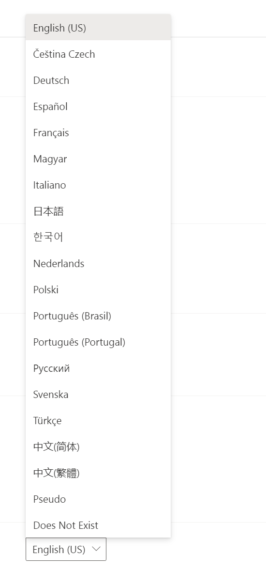| const languageOptions = [{ key: 'en-US', text: formatMessage('English (US)') }]; | ||