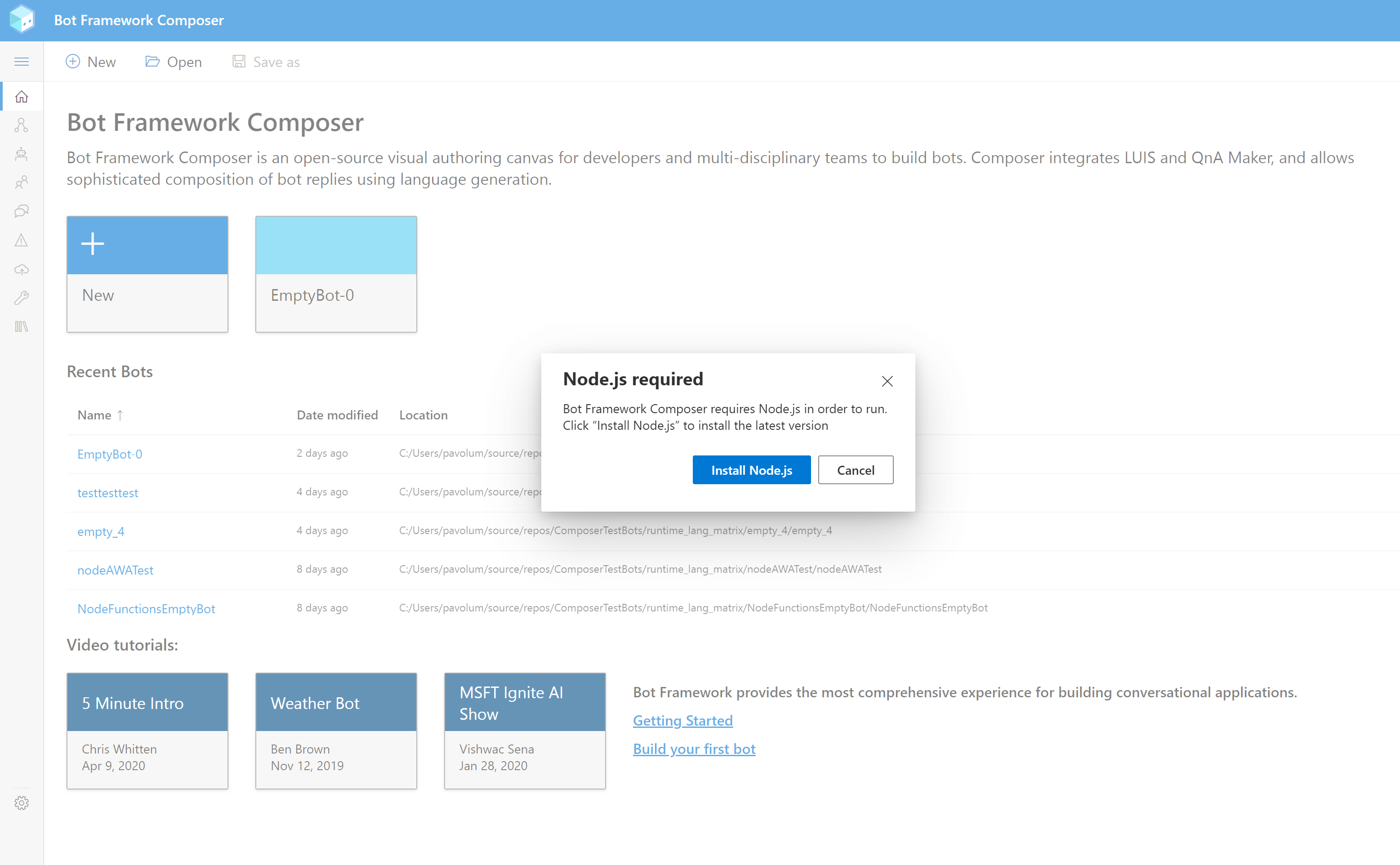 * main: fix: make composer support https proxy (#6766) Force refresh of fluent List via slice (#6810) fix: Telemetry for Orchestrator R13 (#6689) fix: Fixed broken tenant ID on save (#6809) feat: Add devops and app insights to get started (#6790) fix: check for node on app start on users machine and notify if not installed (#6578) feat: Expose default search query, pre-release flag and type for each feed. (#6781) fix: do not provision an endpoint key (#6791) remove folder if project fails to create (#6793) Removed preview from publish type names (#6795) fix: Fixing deep link for QNA and Luis (#6743) Make LUIS, QNA and Speech blocking modals so they cannot be dismiessed while active (#6788) Added workerRuntime value (#6784) fix: apply publishing profile to new runtime during publish (#6719) fix: during publish, do not copy project into a build folder (#6729) chore: Adapters: copy the 'type' passed in the adapter config to fully support adapter schemas (#6697)