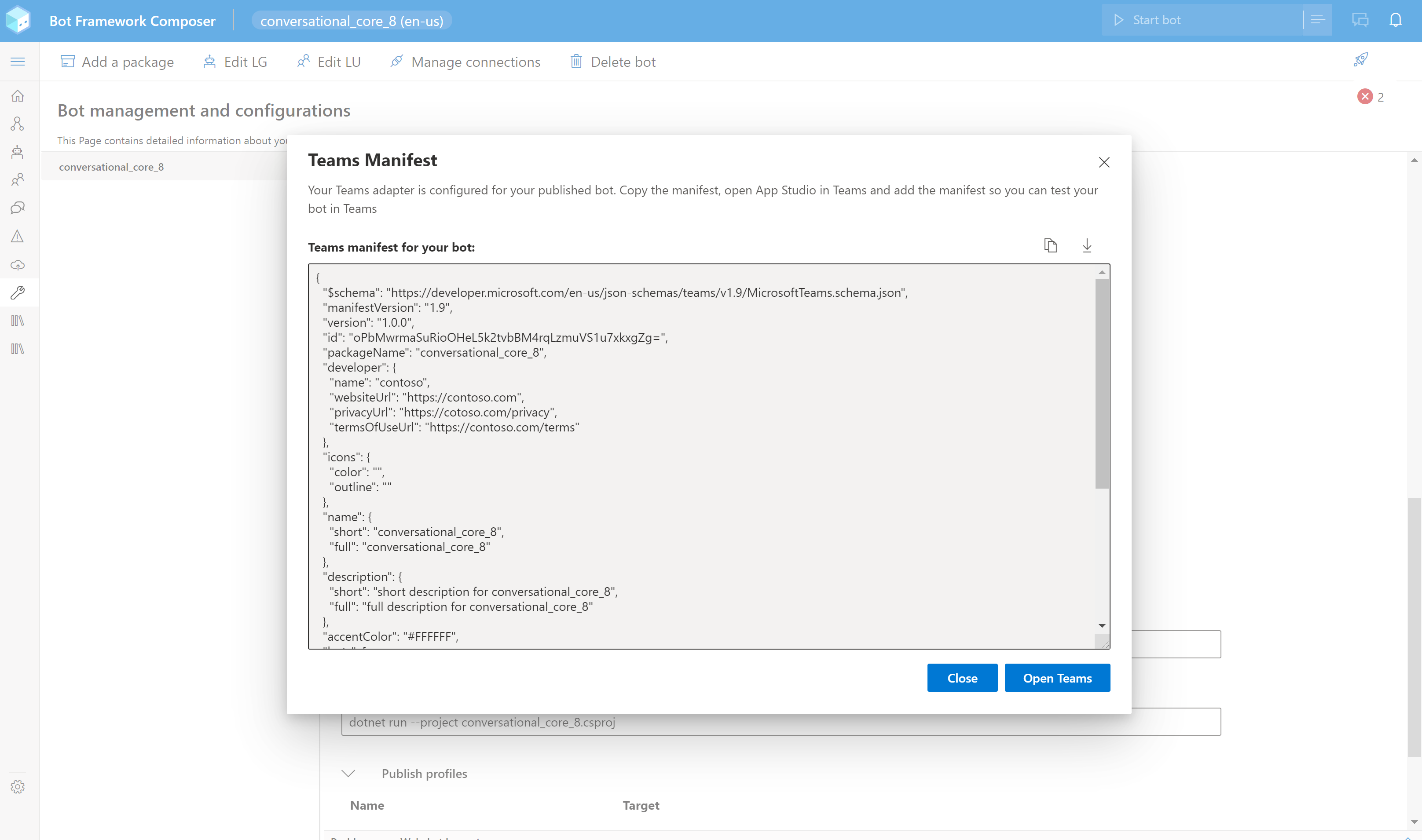 When you enable the teams adapter successfully a modal now pops up providing you with the manifest needed to test your bot in Teams.