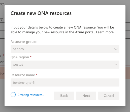 @benbrown benbrown changed the title fix #6708: show progress spinner when qna is being created fix: show progress spinner when qna is being created Apr 6, 2021
