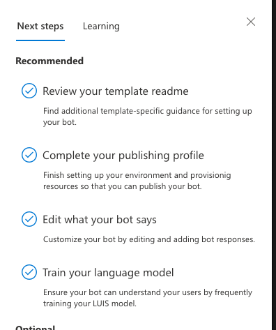 * Add 2 new tasks to get started (view readme, complete profile) and make edit LU, edit LG recommended steps * add formatMessage Co-authored-by: Andy Brown <asbrown002@gmail.com>
