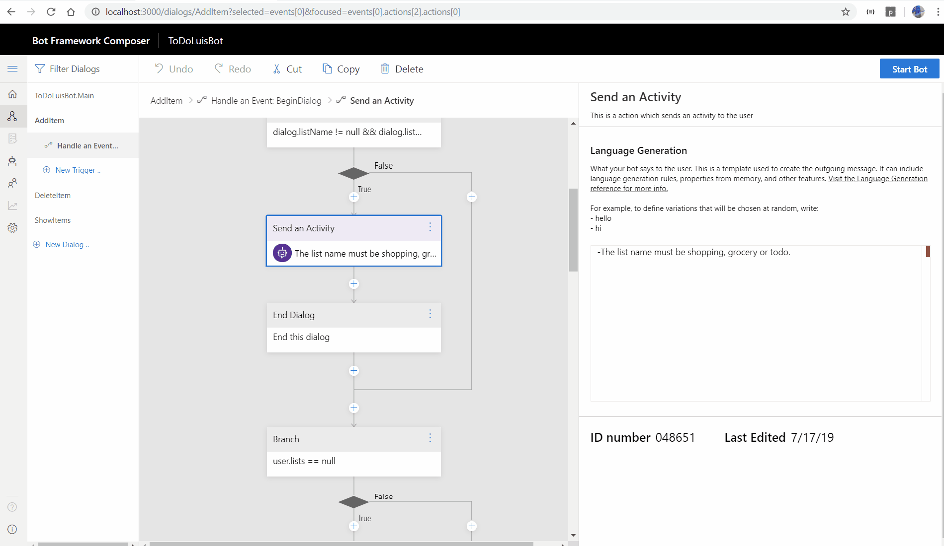 Did you mean for previous non-lg usage, it will hit a bug, unable to update Now Fix it by manually add missing dialog id, if edit again in form, it will convert into lg usage: But for other previous created sample bots, will still have this issue |