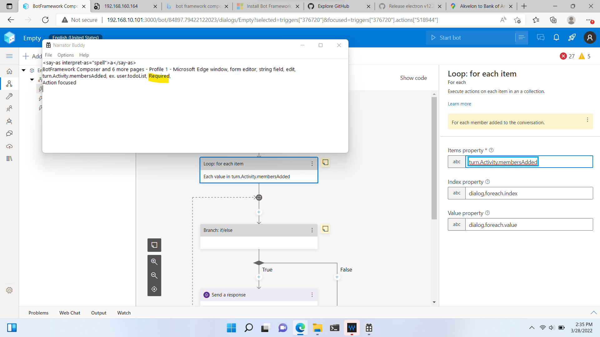 * a11y: ensure there is only one main landmark (#9074) * a11y: ensure there is only one main landmark Remove redundant main landmarks and add the landmark for pages where it is not defined Contains the following changes: - Removed MainContent component as it's not beeing used anywhere - Remove main role duplication from Disigner pages - Add main role to plugin pages - (Unrelated improvement) Link Language modal search field label with the search field * Fix lint issues * a11y: Add aria-required attribute to Form Editor required fields (#9079) * a11y: Add aria-required attribute to FormEditor required fields These fields are visually indicated as required. so add `aria-required` attribute for screenreaders. * Address review comments * a11y: fix aria-label content (#9092) Aria label should start from visible content. This PR fixes the occurrence pointed out in the linked bug. * a11y: fix project tre roles and aria (#9093) This improves aria for the Project Tree control. Includes the following changes: - Remove redundant aria-label causing two elements in the chain to have the same name - Remove redundant tabIndex and move keyboard handler to the place where the keyboard event happens - Make aria-labels to follow the rule: visible content goes first in the label * a11y: add support for intellisense (#9091) * a11y: add support for intellisense The PR adds accessibility properties for the intellisense component, wires them with input components and fixes some observations. List of changes: - Added `aria` attributes set into `Intellisense` component, so it to be passed down to any input rendered - Updated fields. where it makes sense. to include a11y parameters passed by Intellisense - Added scrollIntoView for CompletionElement to ensure the selected element is in the view - Refactored CompletionList a11y properties. Now list has a listbox role when showing suggestions * Fix tests * Fix indent * Fix nit * a11y: address accessibility insights issues (#9148) * a11y: improve debug header aria * Add aria attributes * Exclude empty button from keyboard navigation * a11y: enforce HelpTooltip aria * Make HelpTooltip `aria-label` property required * Remove `aria-hidden` attribute from the help tooltip icon * Add missing aria-labels and roles * Allow focusing tooltips inside menu items * Rework types * a11y: add aria for knowledge base buttons * Add `aria-label` for icon-only buttons * a11y: improve publish screen aria * Add aria for controls * Add column names * a11y: split button aria * Add accessible split button component * Refactor Library split button * a11y: package manager aria * add missing aria labels for controls * Revert "a11y: split button aria" This reverts commit da7e713. * a11y: split button aria * Add accessible split button component * Refactor Library split button * Refactor Chat header split button * a11y: debug panel aria improvements * Add label for bot picker * a11y: upgrade webchat * Upgrade WebChat to the latest version as it fixes some accessibility issues * Revert "a11y: upgrade webchat" This reverts commit 9762cf0. * a11y: improve get started panel aria * Add close button label * fix lint * chore: update electron to currently supported version * Trigger build * Use Electron v14.2.6 * Trigger build * Fix mac signing process * Implement custom electron build fetching * Revert "chore: update electron (#9056)" This reverts commit 226b4df. * fix path