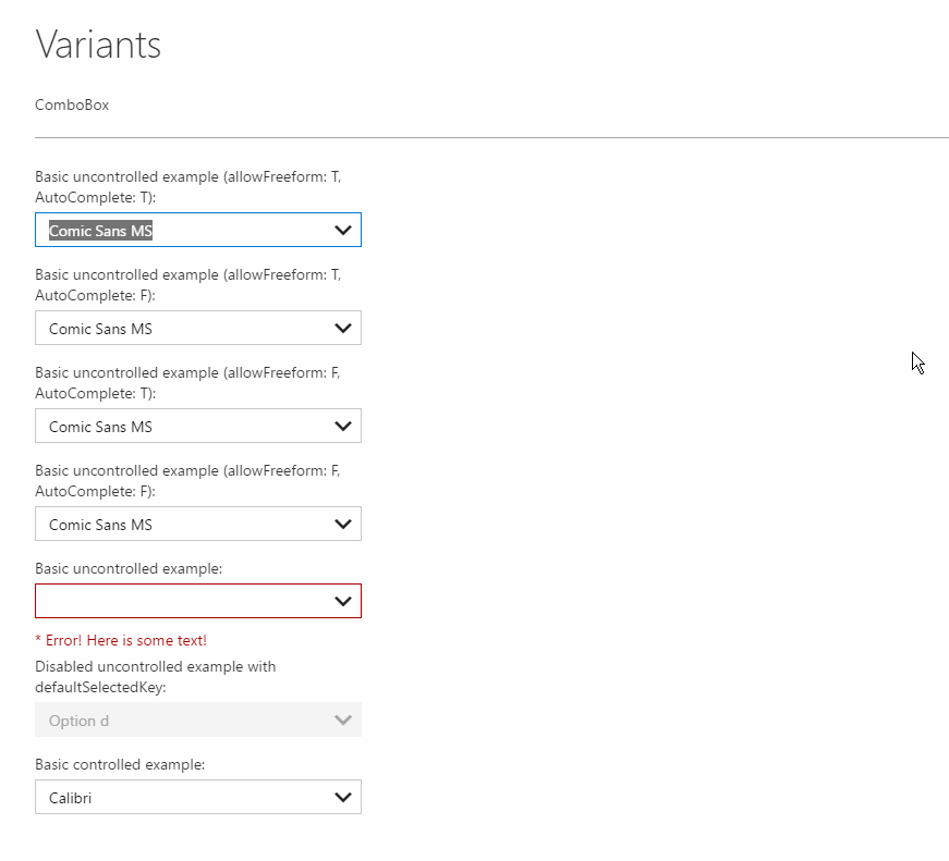 Another side note: if allowFreeform is false, clicking on the combobox will expand the combobox as opposed to when it is true, it places an IP. Also allowFreeform allows the user to enter new options and they will get added to the options, in the uncontrolled case, or will be passed back as the value in the onChanged callback