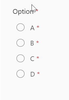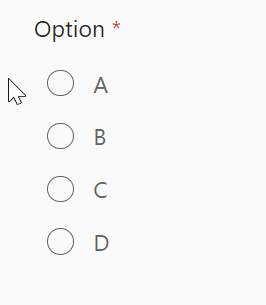 Radios inside a requiredRadioGroupeach display a red "required asterisk" after each of their labels. This means users see a required asterisk for the RadioGroup label and for each of the Radios.New Behavior