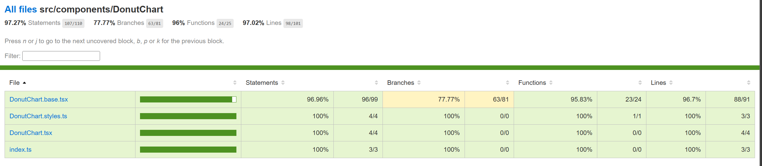 Added component tests for donut chart. Increasing the code coverage for donut chart to 96% (functions covered) as follows: