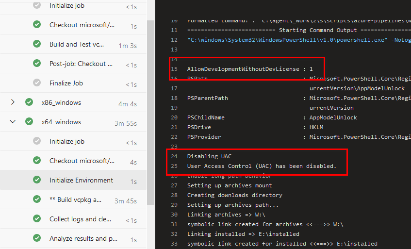 There's nothing about my symbolic links changes that would affect this -- in #11483 I'm fixing our ci command to not rely on symbolic links to get our temporary trees like 'installed' and 'buildtrees' onto a separate disk, I'm not changing anything about the ability to touch symbolic links from inside a port. Notably, the CI machines run Windows Server, not Windows 10 Client, so the "allow dev without license" setting has no effect. |