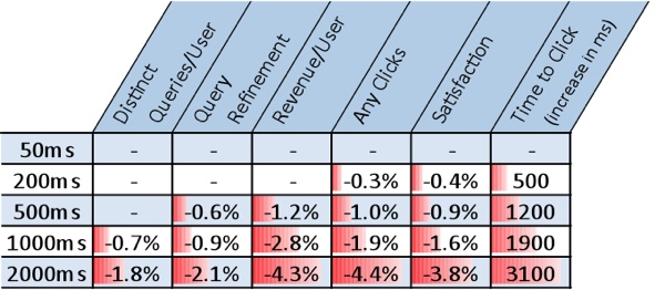 Our experiments demonstrate that slowing down the search results page by 100 to 400 milliseconds has a measurable impact on the number of searches per user of -0.2% to -0.6%