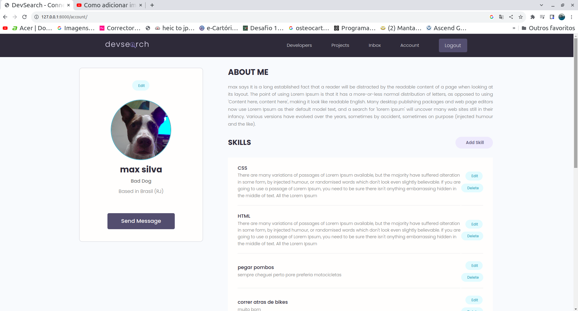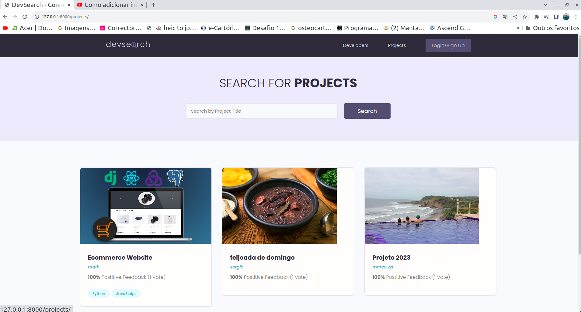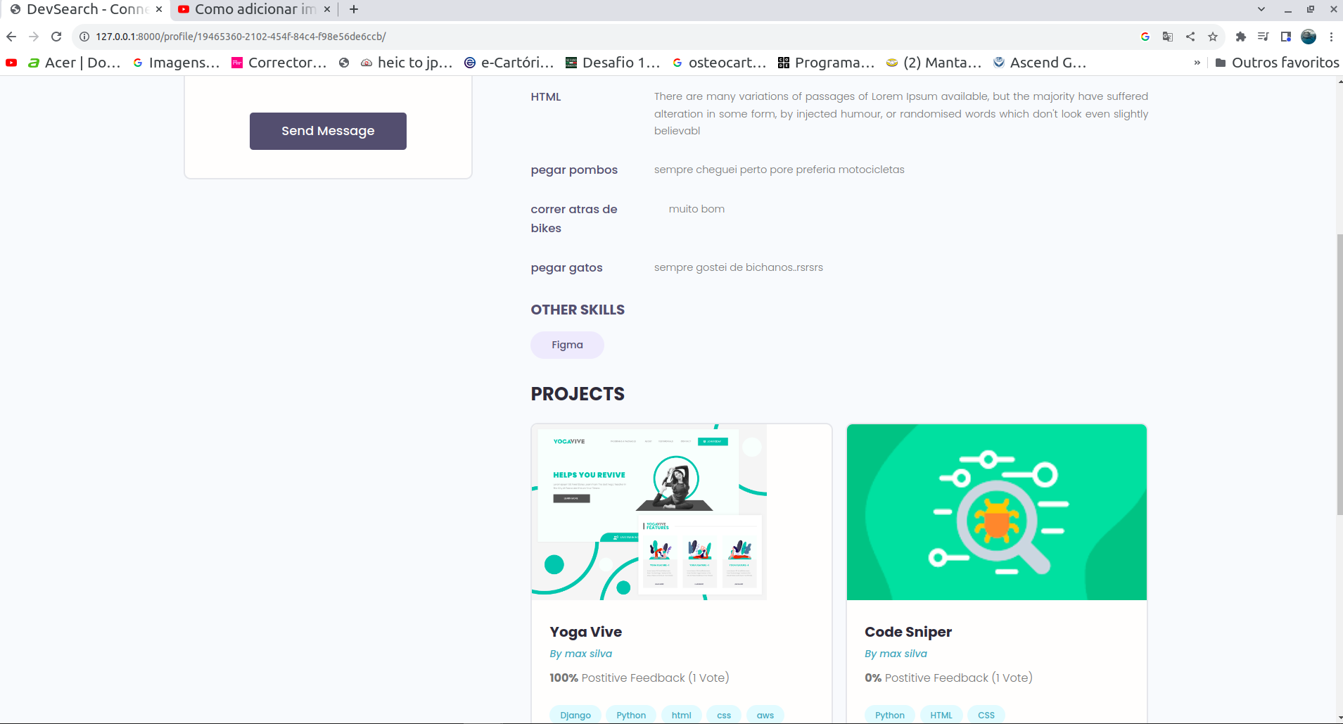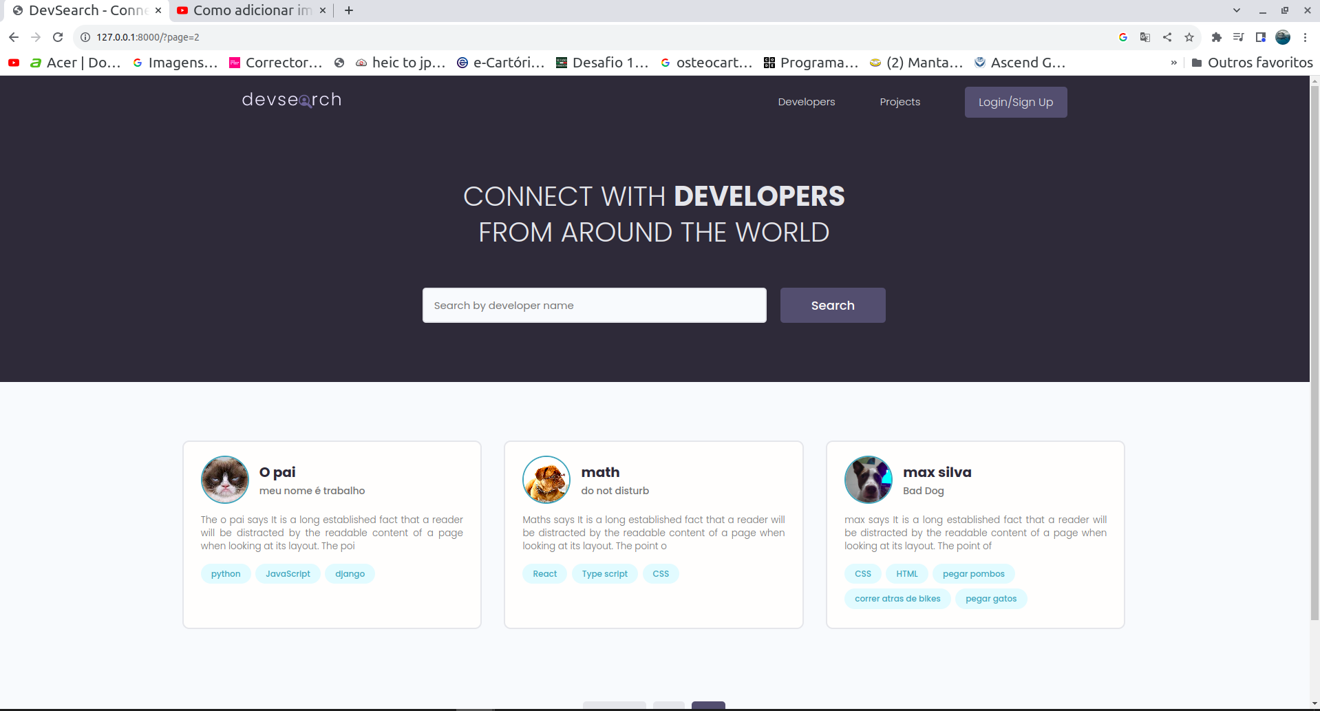 Acompanhamento de video aulas sobre o desenvolvimento de sites usando django. No caso aqui tratasse de um site de apresentação de desenvolvedores e seus portfolios