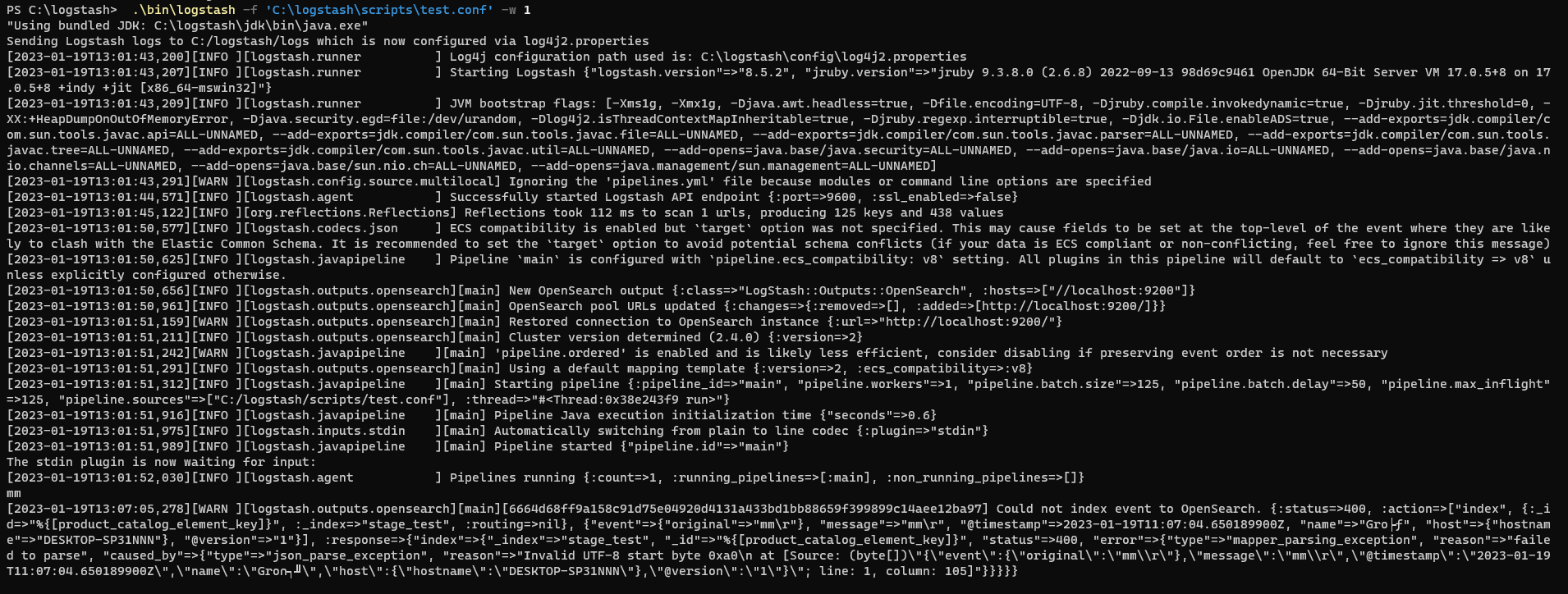 "status"=>400, "error"=>{"type"=>"mapper_parsing_exception", "reason"=>"failed to parse", "caused_by"=>{"type"=>"json_parse_exception", "reason"=>"Invalid UTF-8 start byte 0xa0\n at [Source: (byte[])"{"event":{"original":"\r"},"message":"\r","@timestamp":"2023-01-19T11:07:14.447970Z","name":"Gro�","host":{"hostname":"DESKTOP-SP31NNN"},"@Version":"1"}"; line: 1, column: 98]