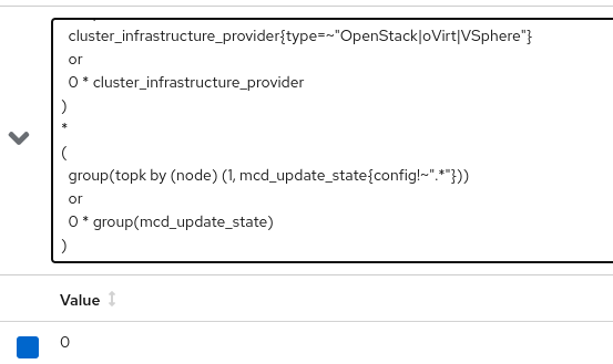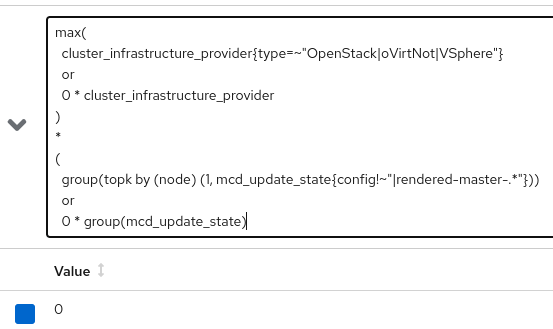 Testing various PromQL in an Impacted infrastructure platform, has at least one machine-config-controlled compute nodeReal queryshows the risk matching with a 1: Other platformsWith No MachineConfig computeAnd with |