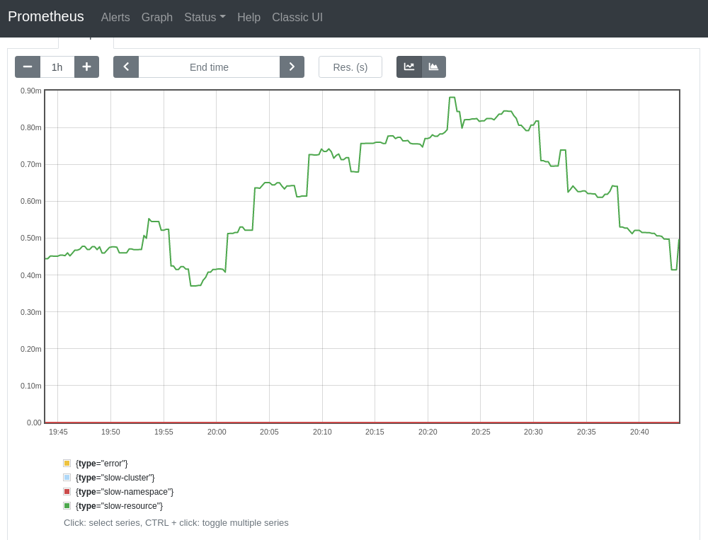 | (sum(rate(apiserver_request_duration_seconds_bucket{job="apiserver",verb=~"LIST|GET",subresource!~"proxy|log|exec",scope=~"resource|",le="0.1"}[5m])) or vector(0)) | ||